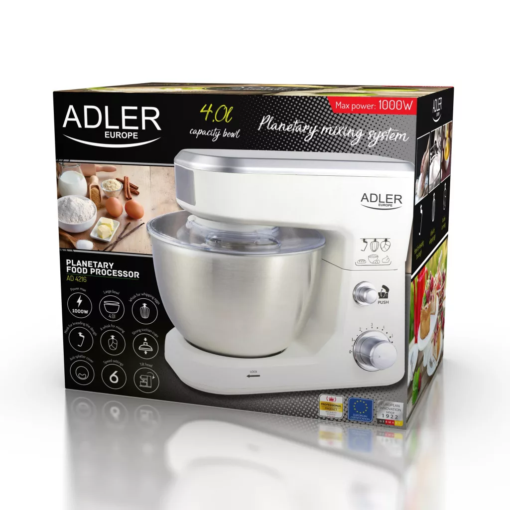 Keverjük össze vagy gyúrjuk fröccsenés nélkül, és válasszunk a 6 sebesség közül a tökéletes működés érdekében. Az AD4216 konyhai robotgép  fel van szerelve ablaktörésgátló fedéllel az összetevők keverés közbeni hozzáadásához. Könnyen használható és tisztítható. 6 sebesség Dönthető fej 4,0 l rozsdamentes acélból készült tál Robbanásgátló burkolat 3 melléklet: • Horog a tészta dagasztásához • Habverő keveréshez • Habverő tojás ostorozására Stabil tapadókorongok Teljesítmény 500 W Legnagyobb teljesítmény 1000 W 220-240 V ~ 50 / 60Hz