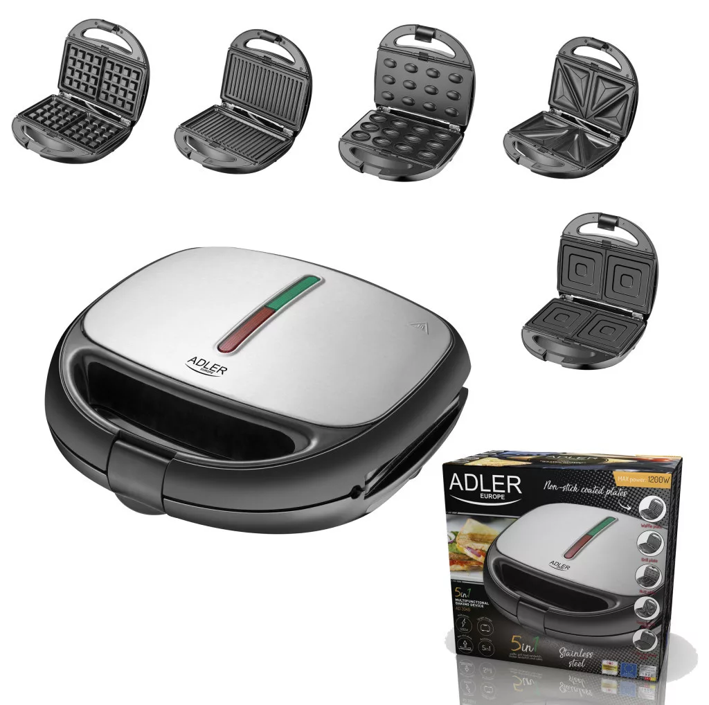 Az ADLER AD 3040 többfunkciós sütőberendezés öt funkciót egyesít egy gépben! Nem kell azon töprengeni, hogy a grill vagy a gofrisütő hasznosabb lesz-e otthon! A termék megvásárlása mellett akár öt különböző készüléket is biztosítunk magunknak egy sütőberendezésben elrejtve! Multifunkcionalitás és hatékonyság Ezúttal nem kell korlátoznia magát! Hányszor szembesültünk azzal a választással, hogy melyik készüléket vegyük meg, és melyik lesz otthon hasznosabb? A család egy része szereti a pirítóst, és szeretnéd időnként megrágcsálni a "diós sütiket"? Megvan a tökéletes megoldás! Készülékünk a legnépszerűbb sütési funkciók közül nem kettő-három, hanem ötöt egyesít! A készülék háromszög alakú tányérokkal van felszerelve pirítós kenyérből készült szendvicsekhez. Meleg reggeli pillanatok alatt minden családtagnak! A hagyományőrzők számára a téglalap alakú tányérokat ajánljuk, amelyek segítségével hagyományos kenyérszendvicseket készíthet. Ezen kívül kétoldalas grillezésre is van kontaktrács, ami nem csak nyáron hasznos bármely bulin! A legfiatalabbak és az édességkedvelő felnőttek számára vannak olyan tányérok, amelyek lehetővé teszik gofri sütését. A dió formájú sütemények sütésére szolgáló forma pedig teljes bónusz. Ki ne emlékezne ezekre a finom édességekre! A nagy választéknak köszönhetően minden háztartástag talál valami érdekeset! Vége az unalmas vacsoráknak és reggeliknek! Biztonság és könnyen használható. A sok funkció miatt úgy tűnhet, hogy ennek az eszköznek a használata bonyolult lesz. Nincs több baj! A tapadásmentes bevonattal ellátott tányérok segítik a szendvicsek és sütemények igazán gyors és hatékony elkészítését. A hűvös érintőfogantyú segít megelőzni a véletlen égési sérüléseket. Két jól látható helyen elhelyezett táp- és hátlapvezérlő lehetővé teszi a készülék működésének vezérlését. A stabil és csúszásgátló gumi lábak megakadályozzák, hogy a készülék elmozduljon a konyhapulton. A készülék könnyen zárható hátlapok és túlmelegedés elleni védelemmel lett ellátva, így a legkisebbek jelenlétében is használható. További előny, hogy a szendvicssütőt függőleges helyzetben is tárolhatjuk, így még több helyet takaríthatunk meg konyhánkban!