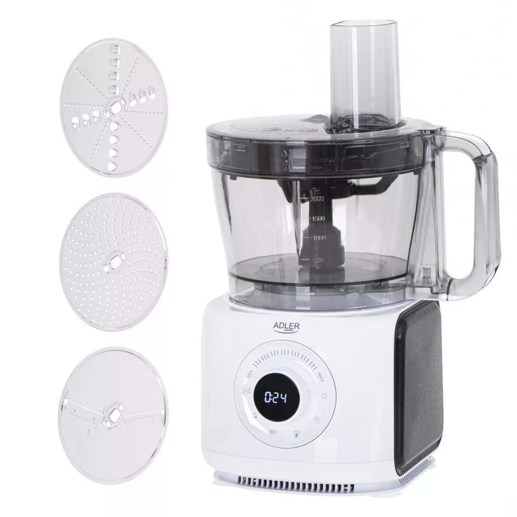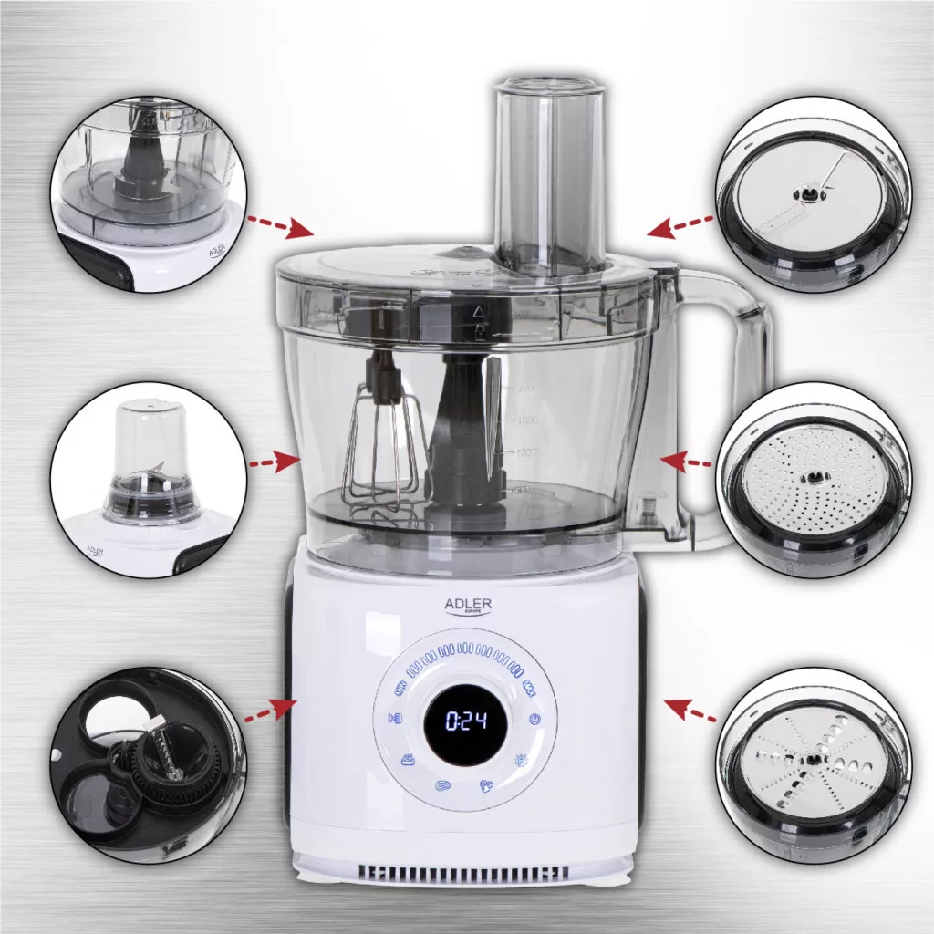 Teljesítmény 2000W-LCD kijelző-7 sebesség fokozat-12az1-ben : aprító/mixer/szeletelő/daráló/kávé és fűszer örlő/dagasztó/szaggató/smoothie készítő/jégtorő-4 automatikus program-3,5L-es tál-Rozsdamentes acél pengék, dagasztó és habverő szárak-3db rozsdamentes acél aprító tengely-2db adagoló szár-műanyag spatula-Túlmelegedés elleni védelem-Fröccsenés gátló-Maximális fordulat 16500 rpm +/-5%- ​