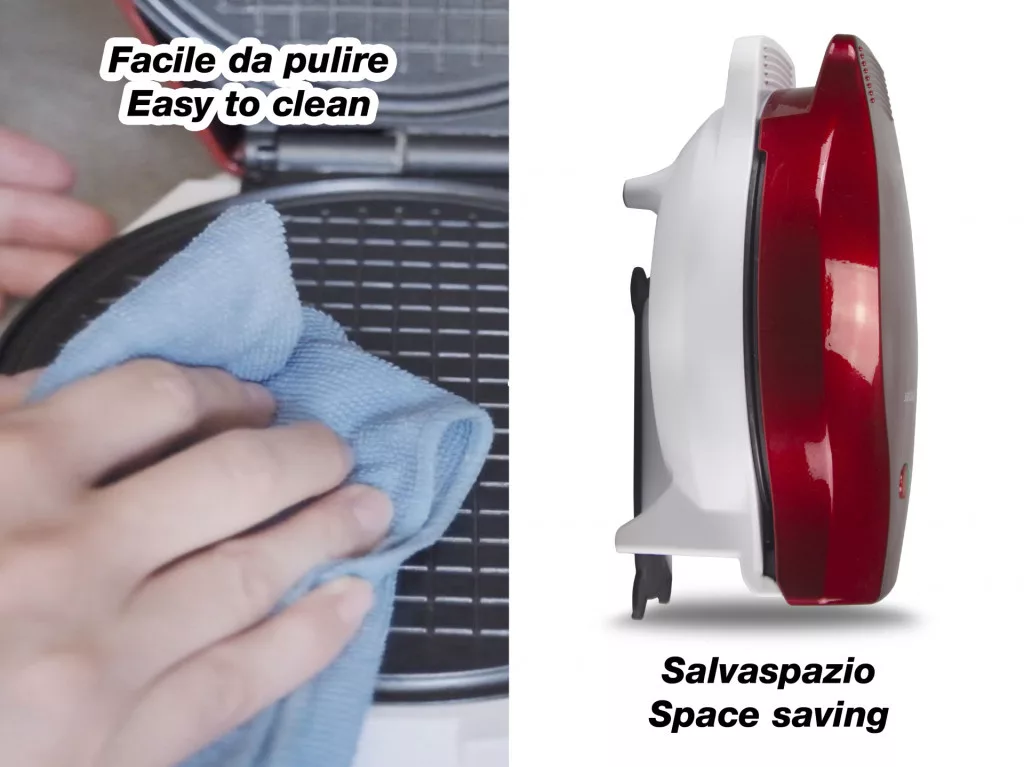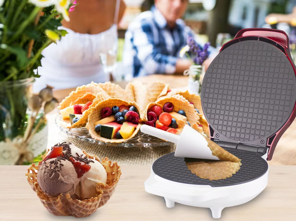 Teljesítmény 1000W 18 cm-es tapadásmentes sütőlap Hőszigetelt fogantyú Működés és készenlét jelző fény Ideális sajtos tallér, fagylaltos csésze kúpok vagy kosarak, sós falatok, sajtos gofri, tojástekercs készítéséhez. Stabil csúszásmentes lábakkal és kábeltekerccsel. Tartozék a kúpformázáshoz.
