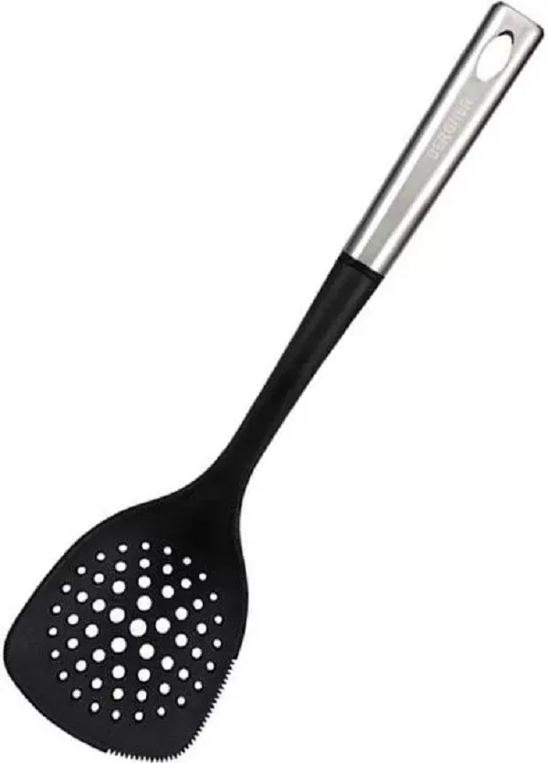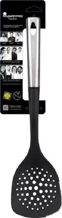 Bergner Masterpro műanyag szedőkanál rozsdamentes fogantyúval 36 x 9 cm. A szedőkanál recés véggel az étel könnyebb kiszedéséhez. Tisztítása karcmentes mosogatószeres vízzel. Gyártó: Bergner Méret: 36 cm Anyag: Rozsdamentes acél Szín: fekete