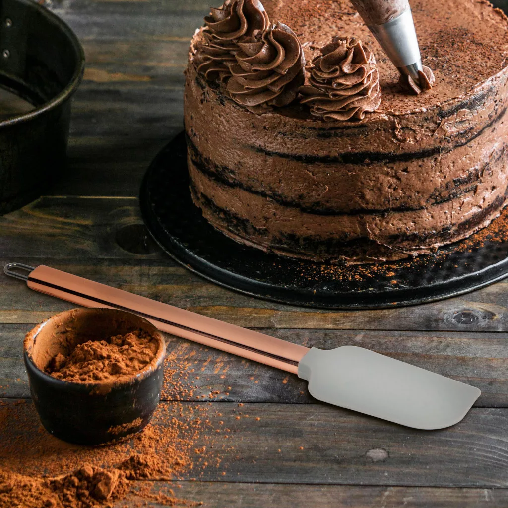 Jól felszerelt konyhák alap kelléke a szilikon spatula, amely segítségével könnyen formázhat, keverhet habokat, krémeket, szószokat. A spatula, hőálló szilikonból készült rugalmas feje megakadályozza, hogy főzés közben sérüljön az edény felülete. A spatula rozsdamentes acél nyéllel rendelkezik, amely elegáns megjelenést és tartósságot nyújt a használat során. A hosszú nyél könnyen kezelhető, kényelmes és hatékonyan használható.