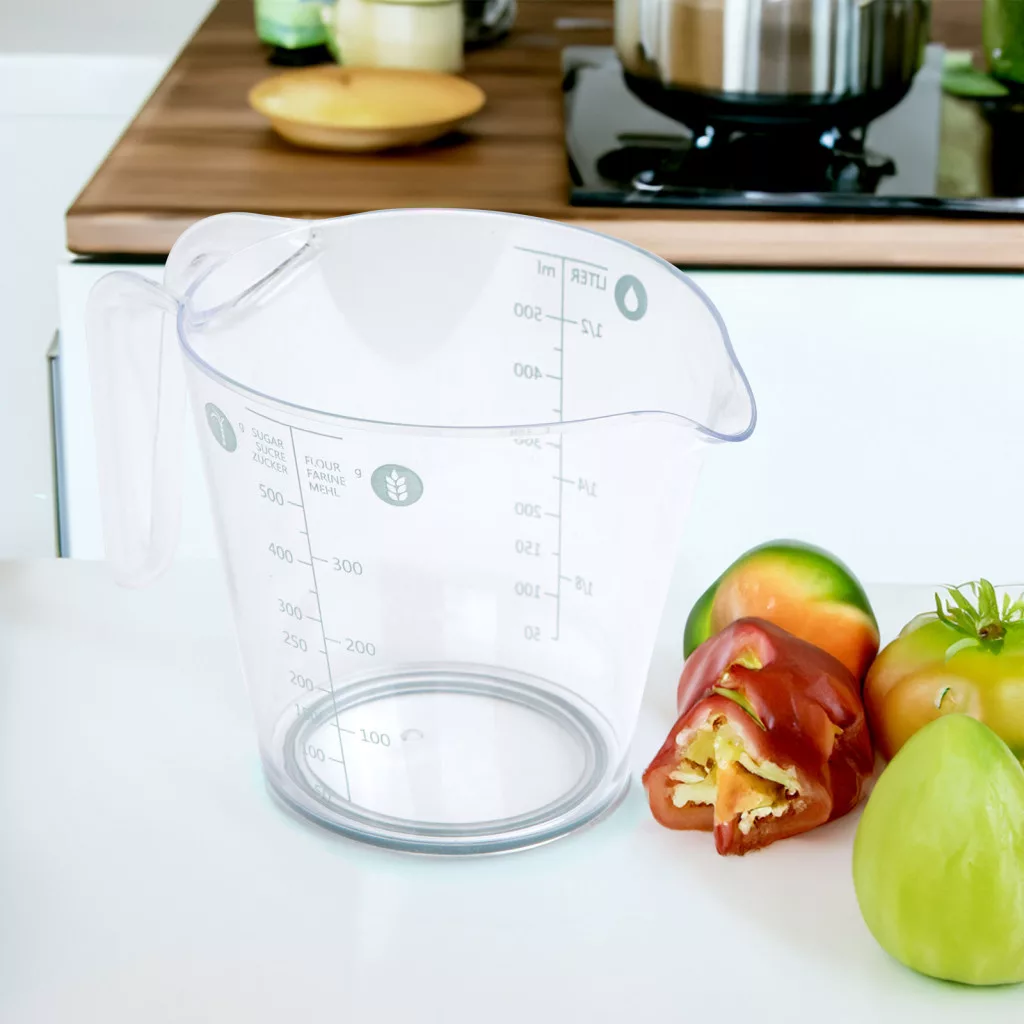 Skálázással elátott mérőpohár, amely segítségével pontosan követheti a receptek által előírt mennyiségeket. Maximum 500 ml folyadék, 500 g cukor vagy 300 g liszt kimérésre alkalmas mérőkancsó.