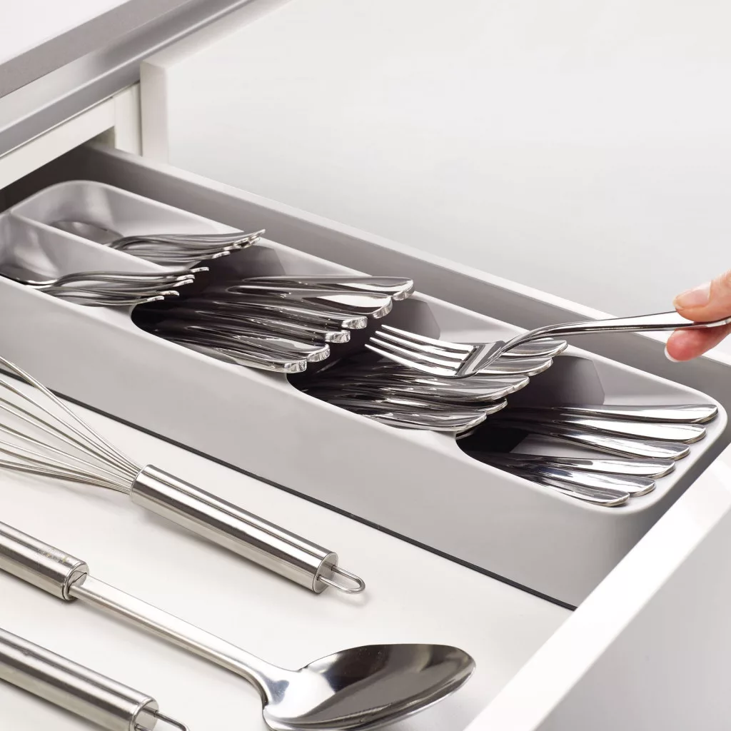 Tárolja evőeszközeit áttekinthetően és rendszerezetten a fiókban is. A 3 nagy és a 2 kisebb rekesz lehetővé teszi a kanalak, kések, villák, kávéskanalak, süteményes villák elkülönített tárolását. A tárolórekeszek speciális, egymás alatti kialakításának köszönhetően nem foglal sok helyet. A kellemes tapintású, vastag műanyag egyszerűen tisztítán tartható, az alján lévő lyukaknak köszönhetően a víz könnyedén távozni tud.