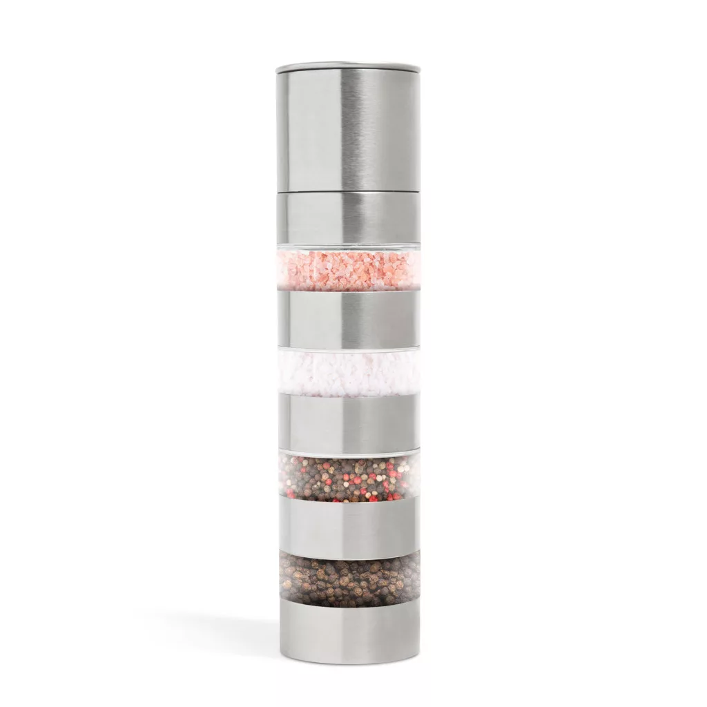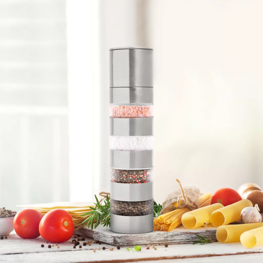 Rozsdamentes acélból készült fűszermalom, amely 4 tárolórésszel rendelkezik, mely egységek sorrendje szabadon változtatható, így mindig kéznek van az a fűszer, amire szüksége van.