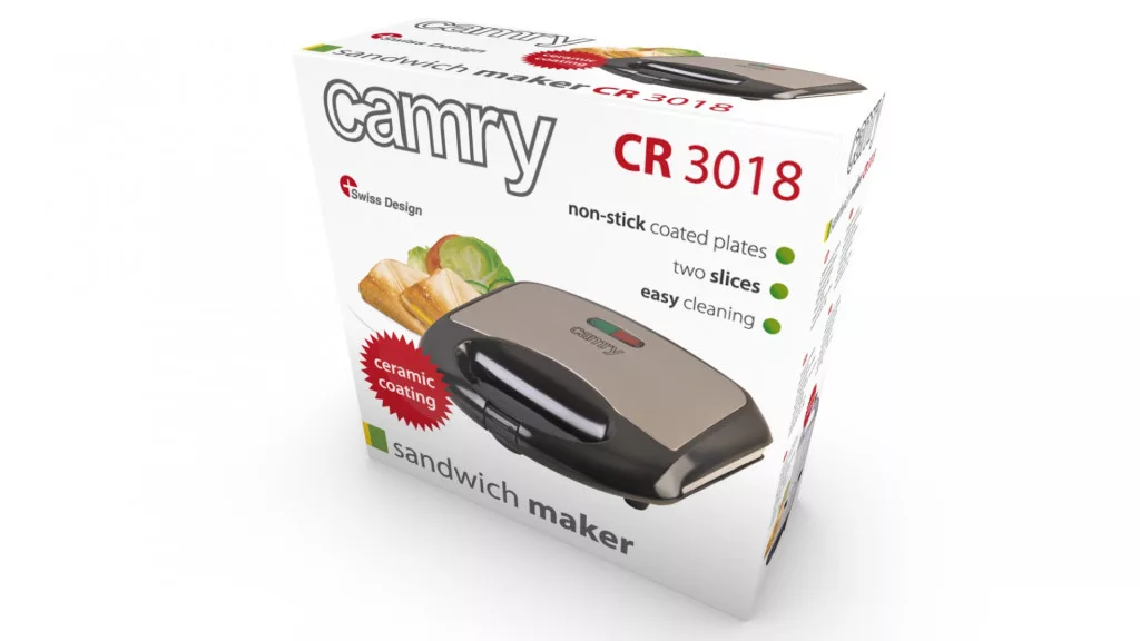 A CR3018 egy hasznos, 700W-os teljesítményű szendvicssütő. Egyidejűleg 2 szendvics készítését teszi lehetővé. A szendvicsek 4 háromszöggé osztódnak. A fűtőlapokon egy speciális fehér kerámia bevonat megakadályozza, hogy az étel odatapadjon a felülethez. Ennek hála a készüléket könnyű tisztán tartani. A termosztát jelzi, ha a sütőlapok megfelelően felmelegettek, szabályozza a hőmérsékletet, és állandó szinten tartja az egész sütés folyamata alatt. Így a szendvicsek ropogóssá és aranyszínűvé válnak. A szendvicssütő függőleges helyzetben tárolható. ​​​​​​​Főbb jellemzők:
