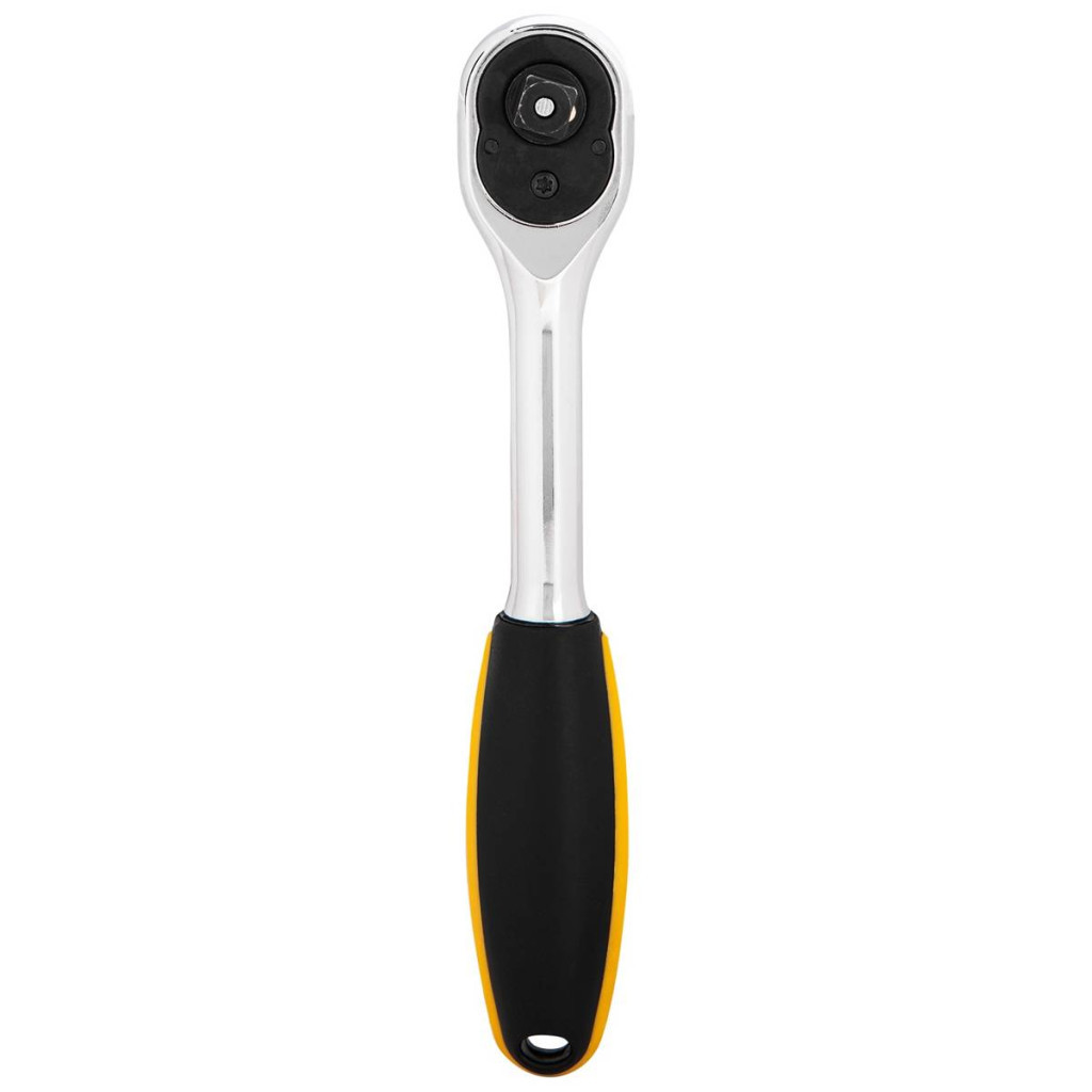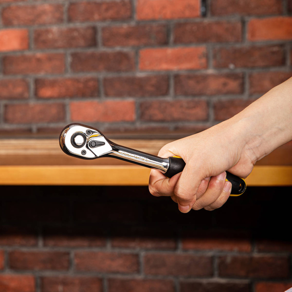 Deli racsnis kulcs, 3/8-os - EDL2421, Sárga/Fekete A Deli Tools EDL2421 racsnis nyél egy praktikus szerszám, amely egyaránt alkalmas professzionális használatra és otthoni műhelymunkára. Kiváló minőségű anyagokból, például Cr-Mo acélból készült. A 45-48 HRC keménységű fejét hőkezelték, hogy a legmagasabb minőségű teljesítményt nyújtsa. A 2 színű nyél tökéletesen illeszkedik a kezébe, és garantálja a kényelmet.