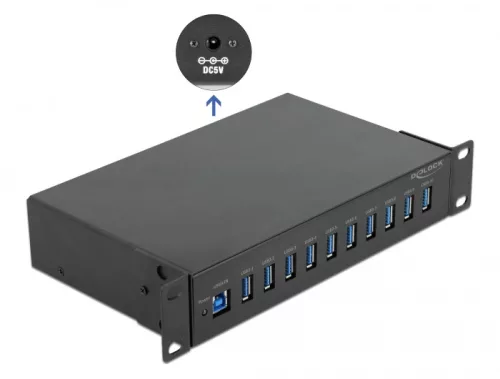 A Delock által gyártott, tartós ipari használatra képes, fémházzal rendelkező USB-hub összekapcsolható egy számítógéphez az USB A-típusú csatlakozón keresztül. A számítógépet 10 A-típusú USB porttal egészíti ki. A hub automatizálási és irodai alkalmazásokhoz használható.