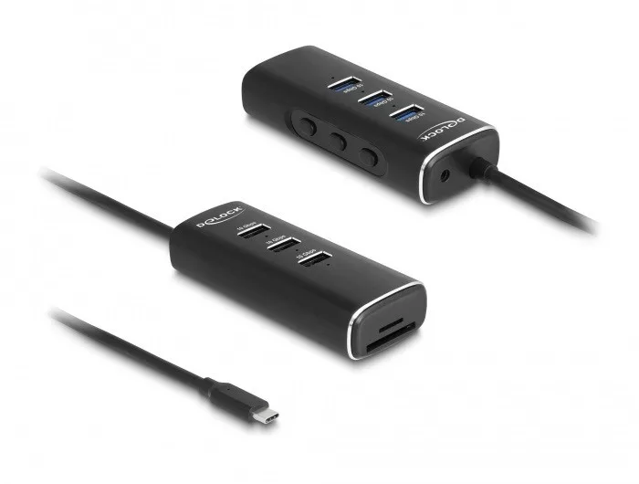 Delock 3 portos USB 10 Gbps hub, SD és Micro-SD kártyaolvasóval USB Type-C , 60 cm hosszú kábellel és portokhoz tartozó kapcsolóval (DL-64234)