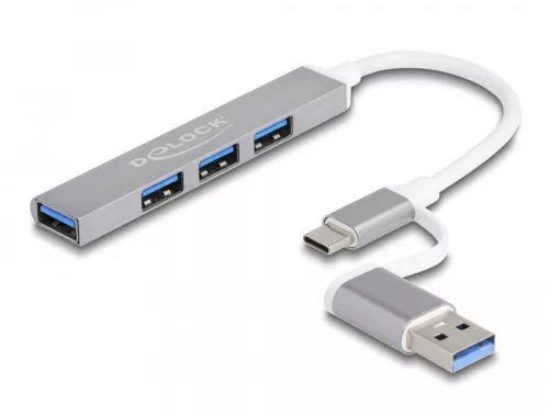 Delock 4 portos vékony USB Hub USB Type-C  vagy USB A-típusú - 3 x USB 2.0 Type-A csatlakozóhüvely + 1 x USB 5 Gbps Type-A csatlakozóhüvely (DL-64214)