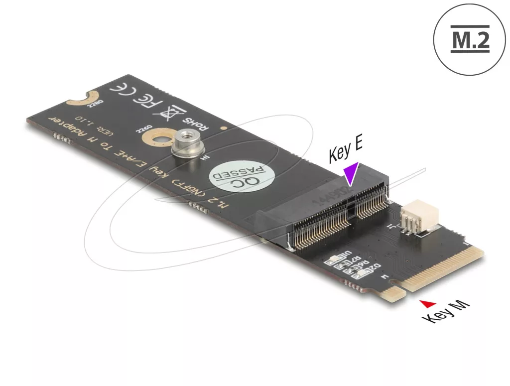 Ez a Delock átalakító az M.2 kulcs M csatlakozóhelyét egy E kulcs csatolóhellyé alakítja át. USB és PCIe jelátviteli modulokat támogat.