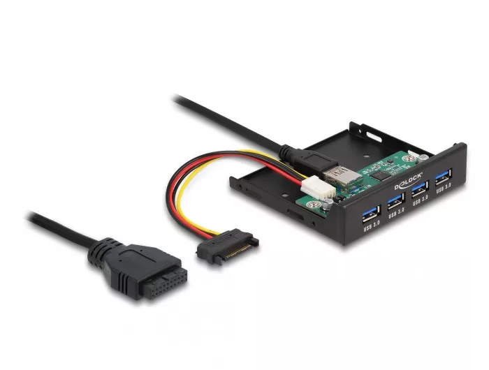 Ez a Delock elosztó egy számítógép 3.5 -os bővítőhelyére telepíthető. Belsőleg kell csatlakoztatni az alaplapon lévő USB-s csatlakozósoron keresztül. Maximum négy USB-eszközhöz, például dokkolóállomáshoz, kártyaolvasóhoz, külső merevlemezházhoz stb. csatlakoztatható.