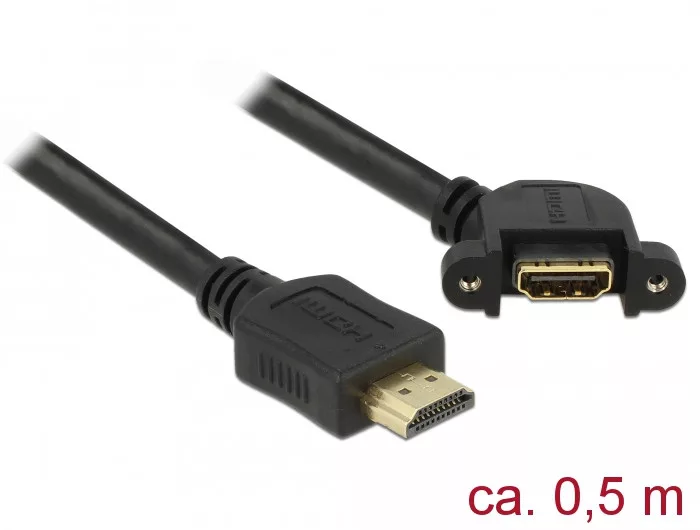 Ez a Delock kábel HDMI-s csatlakozások kibővítésére, illetve különféle eszközök csatlakoztatására használható. A csatlakozóhüvely két csavar segítségével egyebek között megfelelő nyílással rendelkező nyíláskerethez, kábelvezetékhez vagy házhoz rögzíthető. Ezzel a módszerrel HDMI-csatlakozót telepíthet egy könnyen hozzáférhető helyre.