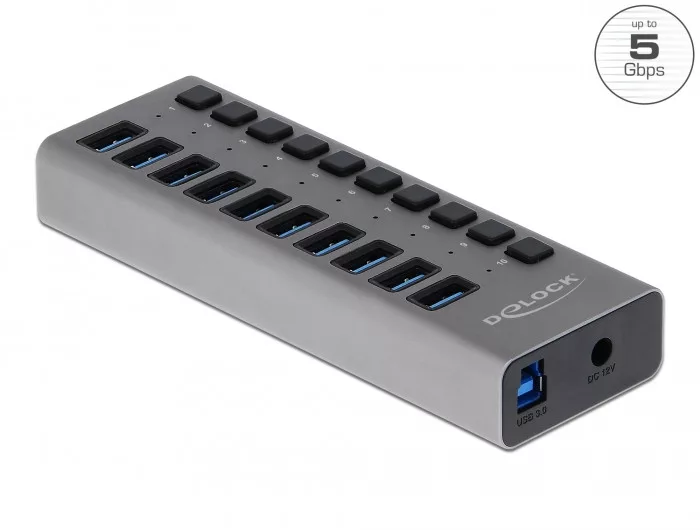 Ez a fémvázas Delock USB hub egység összekötheto egy számítógéphez A-típusú USB csatlakozó felületen keresztül. A számítógépet 10 A-típusú USB porttal egészíti ki. Eszközöket, mint például okostelefonokat rácsatlakoztatva feltöltés vagy adatátvitel valósítható meg 5 Gbps sebességgel. Minden egyes port be- vagy kikapcsolható egyesével a kapcsolók segítségével.