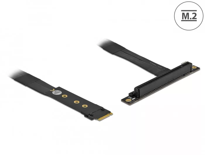 Ez a Delock adapter használható egy PCI Express kártya és egy M.2 csatlakoztató összekapcsolásához. A hajlékony kábel lehetővé teszi a helytakarékos rögzítést a számítógépházban. A további tápcsatlakoztató táplálhatja a PCIe kártyát 12 V feszültséggel szükség esetén.