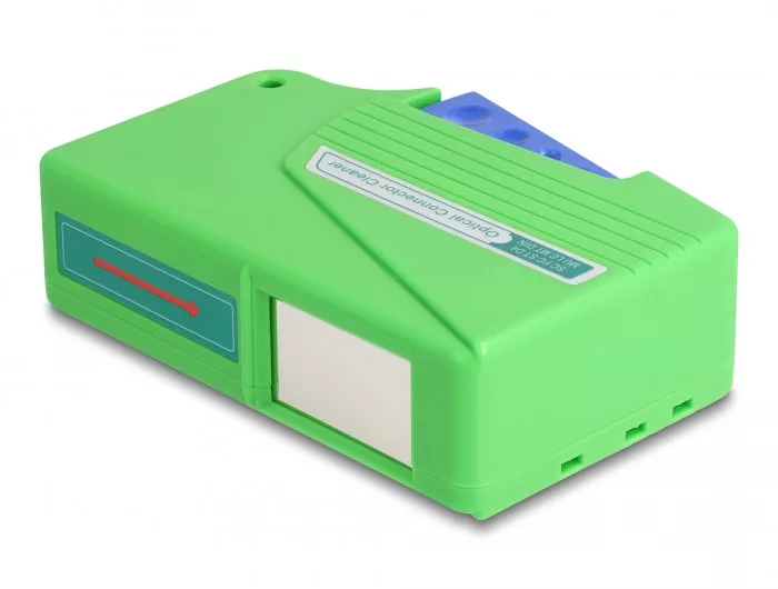 Ez a Delock tisztító kazetta alkalmas optikai szálas konnektorok gyors és alapos tisztítására szennyeződések és koszelemek mint például a konnektor szorító gyűrűjében lévő por eltávolítására. -A következő csatlakozókhoz: SC, LC, FC, MU és E2000 -Akár 550 tisztításhoz -Készült: műanyagból -Szín: zöld -Méretek (HxSzxM): kb. 125 x 85 x 32 mm -Optikai szál tisztító kazetta