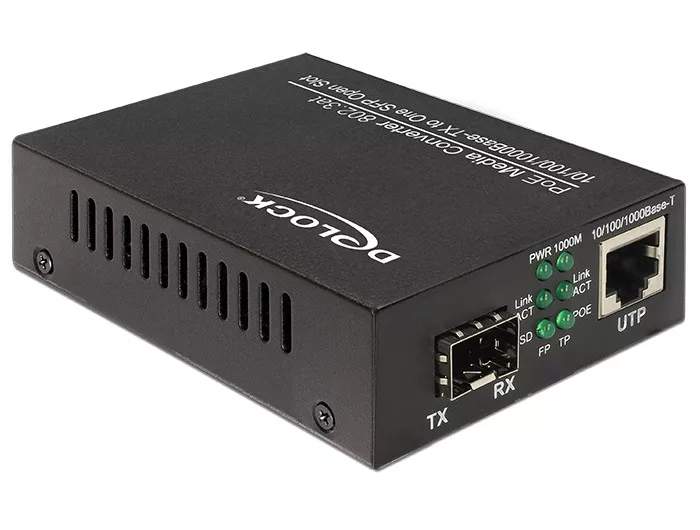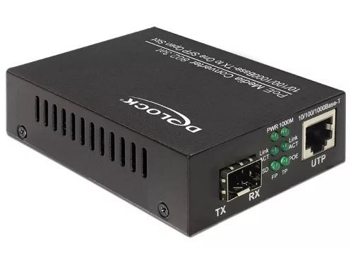 Ez a Delock által gyártott Gigabit Ethernet Media Converter egy optikai szálas interfésszel rendelkező hálózat bővítésére használható. Az SFP foglalatban a Delock különböző opcionális 1 Gb/s-os SFP moduljai használhatók. Az RJ45 port támogatja az IEEE802.3af / 802.3at szabvány szerinti Power over Ethernet-t, így a PoE-képes eszközök, például egy IP-kamera vagy egy PoE-elosztó a hálózati kábelen keresztül táplálhatók.