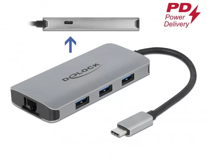 Delock USB 3.2 Gen 1 hub 4 porttal és Gigabit LAN-nel, valamint PD-vel (DL-63252)