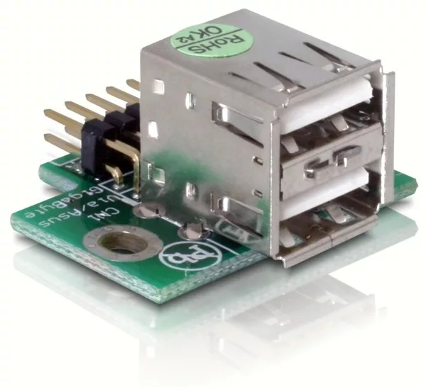 Ez a delock adapter kapcsolódhat egy az alaplapon lévő szabad USB Pinheader-male csatlakozóhoz ez által a számítógép bővíthető lesz 2db belső USB porttal.