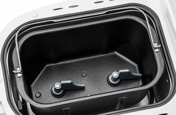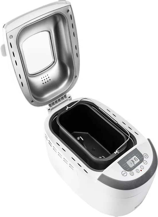 - 2 dagasztólapát - Sütőedény 1250 g-os kenyérhez - Kenyérméret beállítás (3) - Kenyérhéj átsütési fokozat beállítás (4) - Tapadásmentes felületű sütőedény, nem kell megkenni. - Sikérmentes kenyérsütő program. - Kémlelőnyílás a sütés felügyeletéhez. - Hőmérsékleten tartás funkció (60 perc). - Max. teljesítményfelvétel: 850 W - 12 előre beállított program. - Központi LCD kijelző. - Késleltetett indítás max. 15 óra Tartozékok: - Nagy mérőpohár - Mérőkanál - Dagasztólapát kihúzó kampó