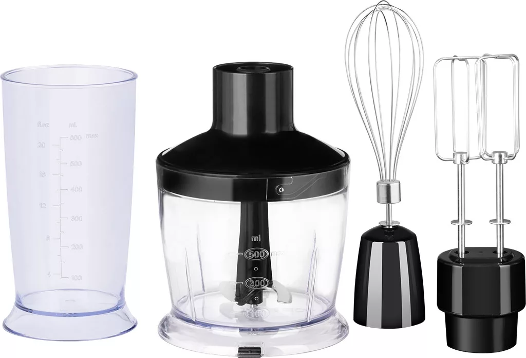 • A csomagban található praktikus tartozékok (zöldség aprító 500 ml-es tartállyal, dupla habverő, dróthabverő, 600 ml-es edény)