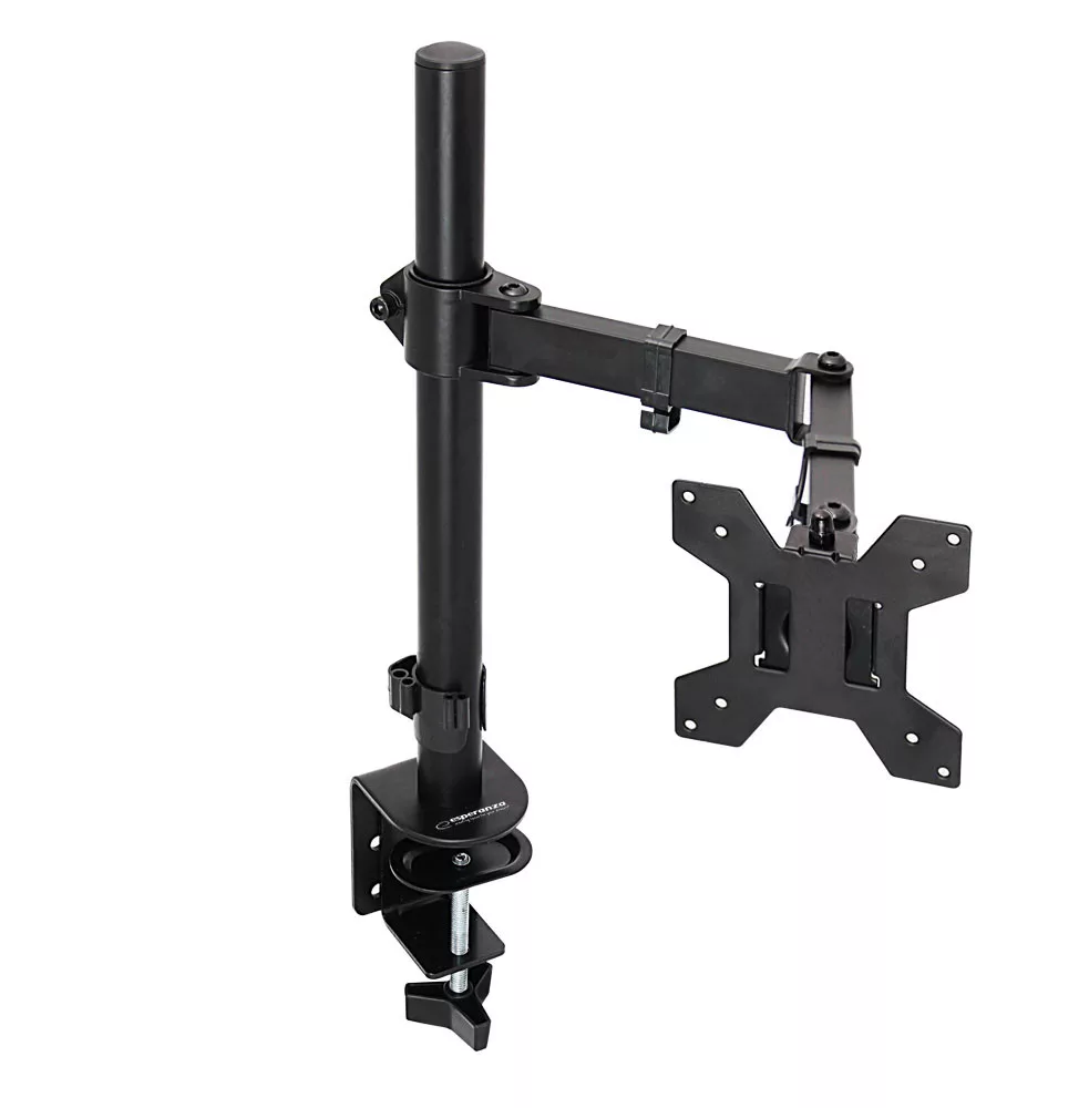 Fém, erős és stabil asztali konzol Esperanza HORKOS 10"-tól 27"-ig terjedő méretű számítógép-monitorokhoz. A konzol lehetővé teszi a monitor asztalhoz rögzítését, teljes mértékben állítható az optimális látószög és magasság érdekében, miközben helyet takarít meg az asztalon. Könnyen felszerelhető és rögzíthető egy masszív, állítható fém bilincs segítségével, amely puha béléssel van ellátva, hogy megakadályozza az asztal felületének karcolódását. Kompatibilis a 75 x 75 mm-es és 100 x 100 mm-es VESA szabványokkal. Széleskörű beállítási lehetőségeket kínál, beleértve a magasságot, a dőlésszöget és a 360 -os képernyőforgatást.