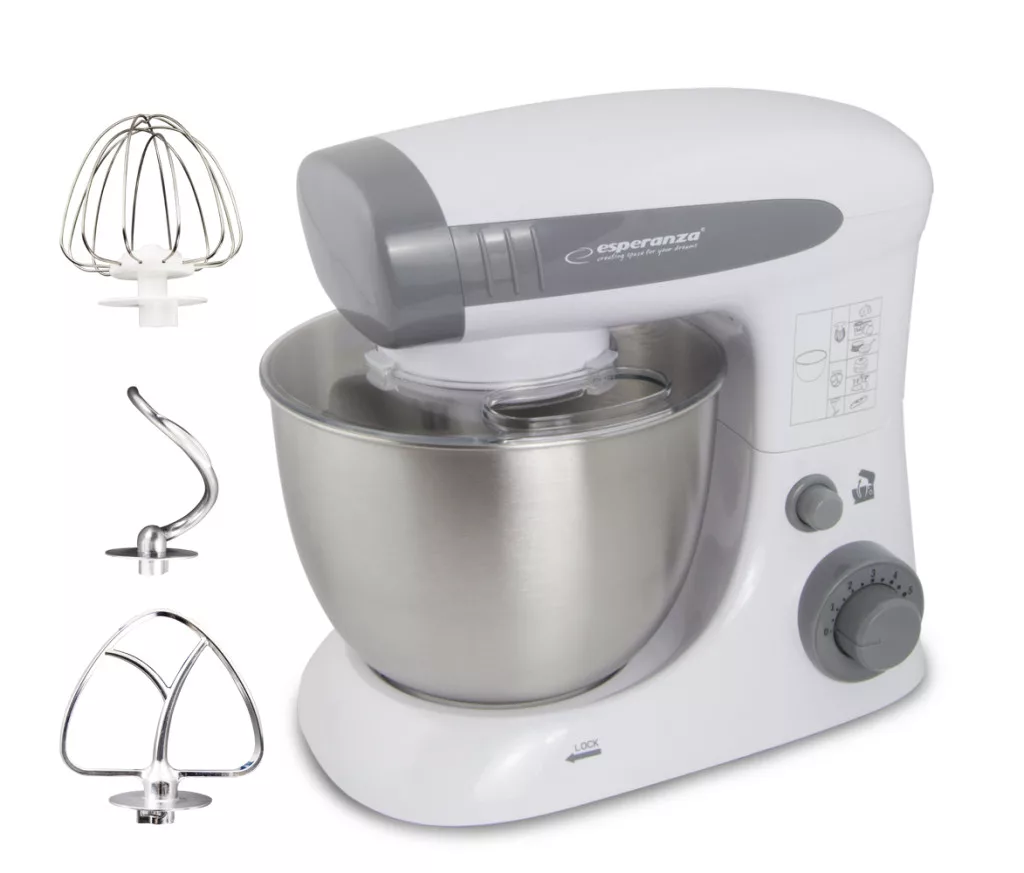 "MŰSZAKI ELŐÍRÁSOK Névleges feszültségtartomány: 220-240 V Névleges frekvencia: 50/60 Hz Védelmi osztály: I Teljesítményfelvétel: 800 W Rozsdamentes acél tál kapacitása: 4 l 6 sebesség impulzus funkcióval Folyamatos üzemidő normál terheléssel: 12 perc Lehűlési idő a következő használat előtt: 20 perc Fém tésztakampó, habverő és habverő Csúszásgátló gumilábak Automatikus leállítás a túlterhelés elleni védelemhez Fröccsenés elleni védelem Kábel hossza: 100 CM Termék mérete: 36,5*30,5*21 CM Nettó súly: 4,45 KG"