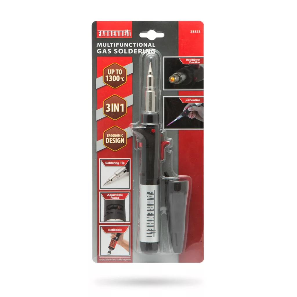 A Fahrenheit multifunkciós gázüzemű forrasztószett hatékonyan ötvözi a hőlégfúvó és a gázforrasztó ceruza tulajdonságait. Felhasználható különböző finomelektronikai forrasztások, hőlégfúvás, zsugorítás (zsugorcső), szúrólánggal történő hevítés munkálatokhoz. Ez a kompakt készülék rengeteg hasznos funkcióval rendelkezik: biztonsági kapcsoló, lángszabályzó, folyamatos láng kapcsoló, lángkioltó gomb, piezo gyújtórendszer. A forrasztópáka-hegy lecsavarásával használhatjuk hőlégfúvóként is. A gáztartály újratölthető ezáltal a készülék hosszú időnát használható. A szett tartalma:
