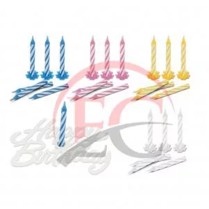 A szett tartalma: - Happy Birthday tortába szúrható felirat, gyertyatartó résszel - 12 db gyertyatartó (3 db sárga, 3 db rózsaszín, 3 db fehér, 3 db kék) - 24 db gyertya (6 db sárga, 6 db rózsaszín, 6 db fehér, 6 db kék)