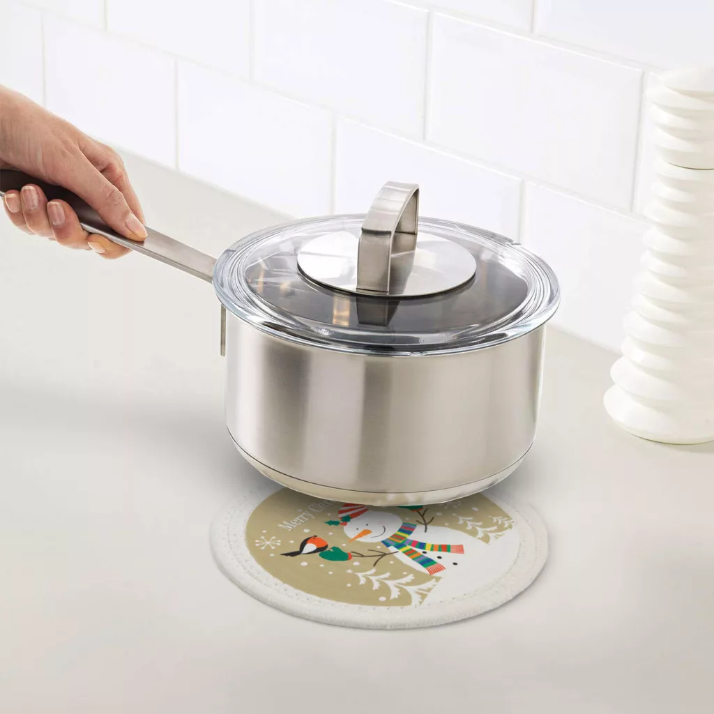 Textilből készült, karácsonyi edényalátét, amely megakadályozza, hogy károdosjon asztala, pultja a forró edények hatására. Az alátét beleillik az ünnepi asztali dekorációba, így teljes lehet az összhang.