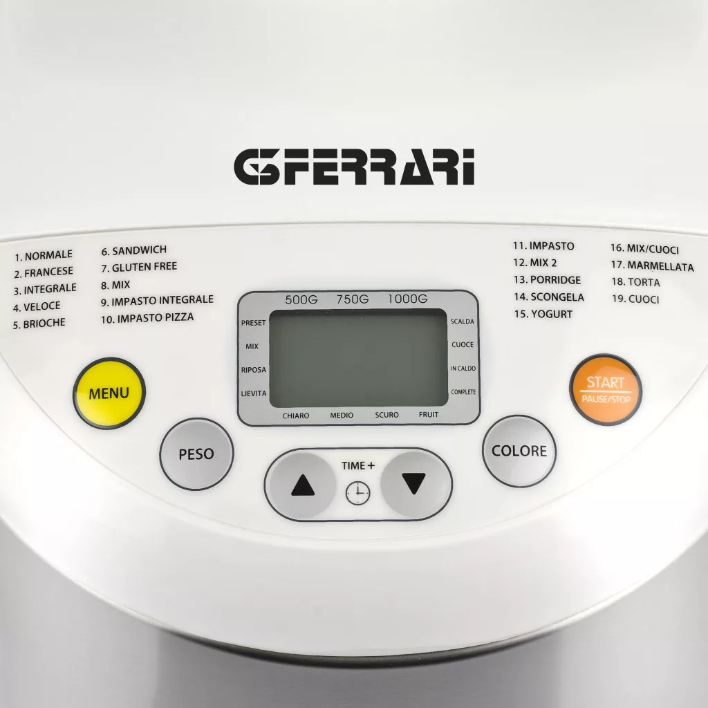 A Pagnotta kenyérsütőgépünk segítségével egyszerűen és biztonságosan, egészséges és természetes anyagokból, kiváló minőségű házi kenyeret készíthet. A G3 Ferrari Pagnotta 19 előre beállított programmal készül, amelyek lehetővé teszik, hogy minden nap más-más megoldással elégítse ki főzési fantáziáját. Készíthet hagyományos kenyeret, teljes kiörlésű, hagyományos vagy különleges lisztekkel. Sós vagy édes, száraz vagy friss ételeket, vagy akár remek olasz focacciát, pizza és tészta alapot, akár puha süteményhez és fánkokhoz, lekvárral, joghurttal és más összetevőkkel. A G3Ferrari Pagnotta különösen alkalmas gluténmentes kenyérsütésre, speciális gluténmentes sütés programmal. Ez a kenyérsütő az egész család napi szükségleteinek kielégítésére készült, de az egyedül élők számára is ajánlott, mert praktikus súlybeállításának köszönhetően akár fél kilogrammos cipók is elkészíthetők nagyon rövid idő alatt.