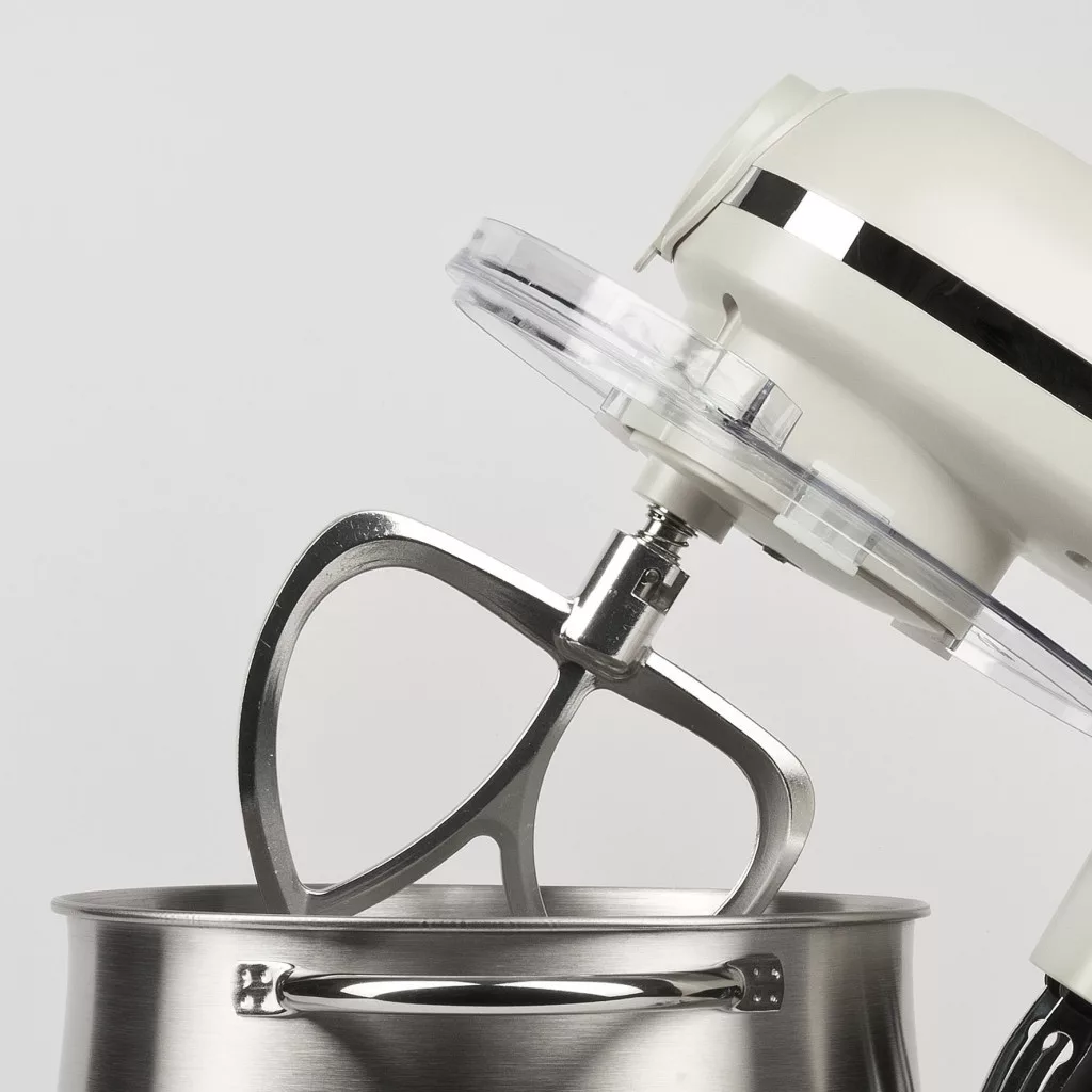 • Tartozékok: Dagasztó kampó és keverő alumíniumból, habverő rozsdamentes acélból, átlátszó műanyag fedél.