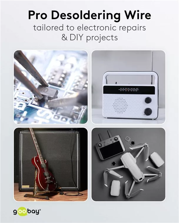 • Hasznos eszköz a forrasztási maradékok eltávolításához. Helyezze a kiforrasztóhuzalt a forrasztókötés tetejére, és a forrasztópákával melegítse az eltávolításhoz