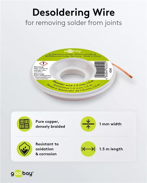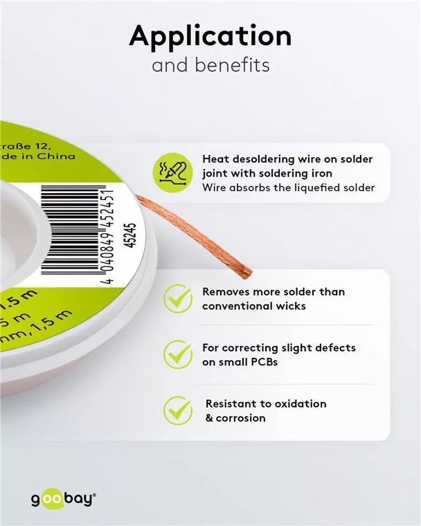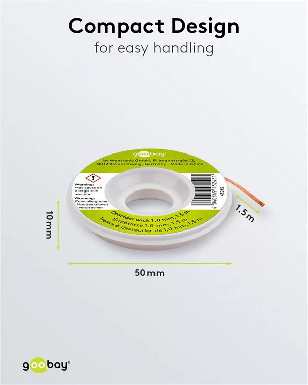 • Kiforrasztó kanóc tiszta rézből, oxidáció- és korrózióálló, jó hővezető képességgel, kevés maradékanyaggal, nincs töréspont