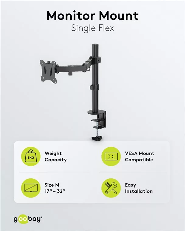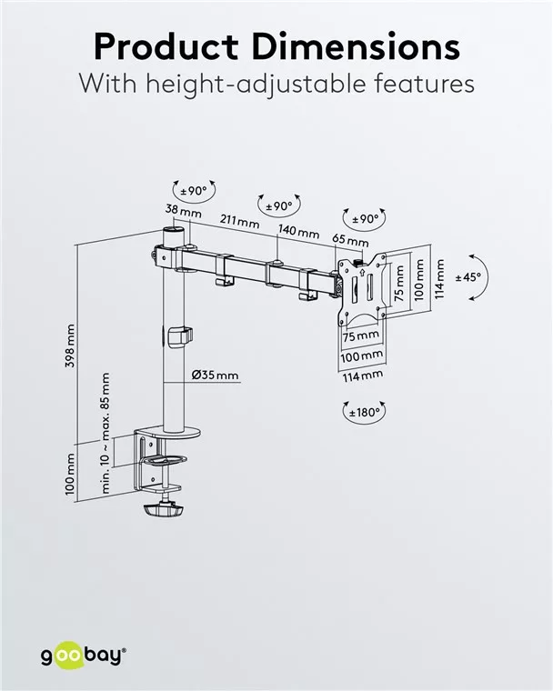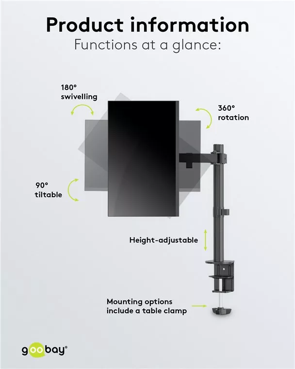 A Goobay márka megbízhatósága és kiváló minőségű anyaghasználata révén garantált a hosszú távú stabilitás és tartósság. A fémszerkezet biztosítja a monitor stabil tartását, miközben az optimális betekintési szöget is fenntartja. A monitor döntési, forgási és magasságállítási lehetőségei segítenek a testreszabott munkakörnyezet kialakításában, csökkentve ezzel a hosszú távú kényelmetlenségeket és növelve a termelékenységet.