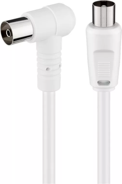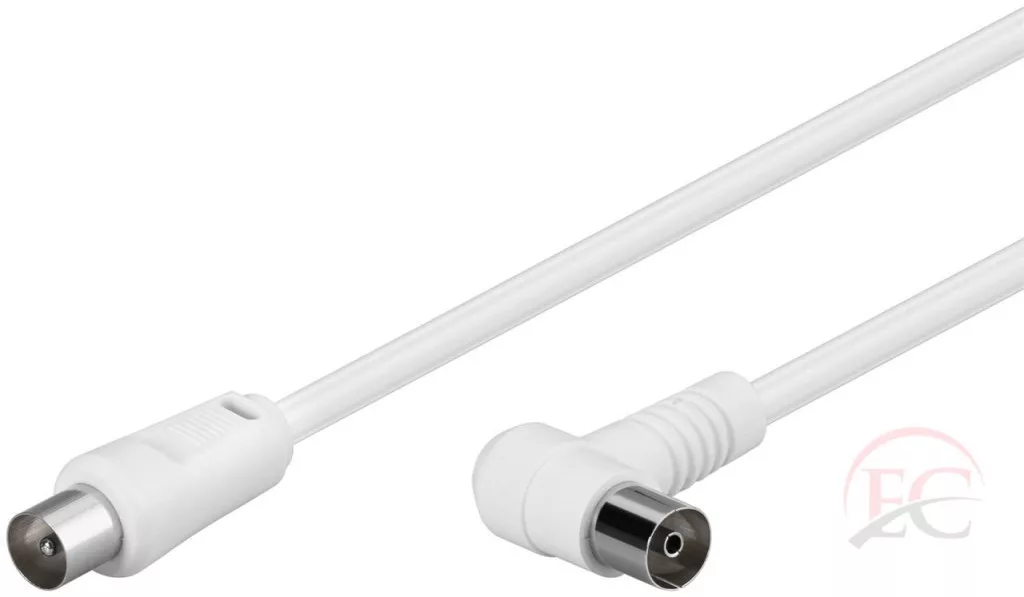 Koax kábel szerelt 90 fokos hossz:1,5 m szín:fehér kétszeresen árnyékolt koaxiális kábel impedancia 75 ohm belső vezeték: 0,5 mm CCS külső átmérő: 5,3 mm