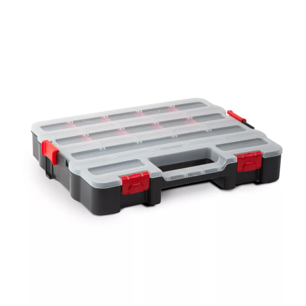 Innovatív rendszerező táskák, amelyek tetszőleges sorrendben egymáshoz kapcsolhatóak, így egyidejűleg könnyedén hordozhatóak. Az oldalán található retesz segítségével oldhatóak a ládák, így gyorsan hozzáférhető az éppen szükséges segédanyag. Az átlátszó fedélnek köszönhetően áttekinthető a beltartalom, akár kinyitás nélkül megtalálhatja a szükséges táskát. Rendszerezze a különböző méretű és típusú csavarokat, tipliket, alátéteket, anyákat, szerelési segédanyagokat külön-külön táskába a gyors és hatékony munkavégzés érdekében! A ládák strapabíró, erős műanyagból készültek, így hosszú élettartammal rendelkeznek. Praktikus, hiszen akár 18 db tárolórekesz is kialakítható, a mozgatható elválasztók segítségével. Ha nem használja az opcionális elválasztókat 2 db nagyméretű tárolórekeszt is rendelkezésre állhat, ahova akár csavarhúzót, villáskulcsot vagy egyéb szerszámot is tehet.