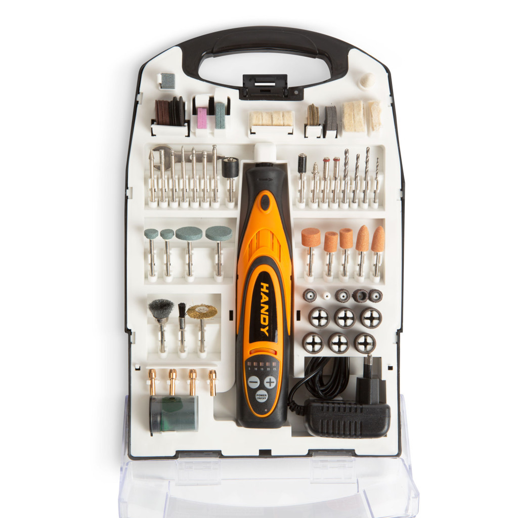 A HANDY DRILL csiszoló, gravírozó és fúrógép kifejezetten otthoni, manikűr/pedikűr és barkács célra lett kifejlesztve. A beépített akkumulátornak köszönhetően, kábelek nélkül, bárhol használhatja a szerszámot. Segítségével kisebb furatokat készíthet, csiszolhat, polírozhat, gravírozhat vagy akár vághat. Ideális lehet sorjás élek eltávolításához. Maximális furat befogadó képessége Ø3,2 mm. A különféle kiegészítők egyszerűen és gyorsan csatlakoztathatók. Kompakt, kis méretének és súlyának köszönhetően könnyen kezelhető a szerszám akár nehezen hozzáférhető helyeken is. Alkalmas lehet fa, fém, műanyag precíz megmunkálására is.