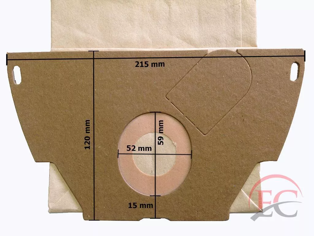 Lyuk átmérő függőleges: 59mm Lyuk átmérő vizszintes: 52mm Lyuk távolság: 17mm Magasság: 120mm Szélesség: 214mm Zsák hosszúság: 190mm Zsák magasság: 120mm Zsák szélesség: 150mm