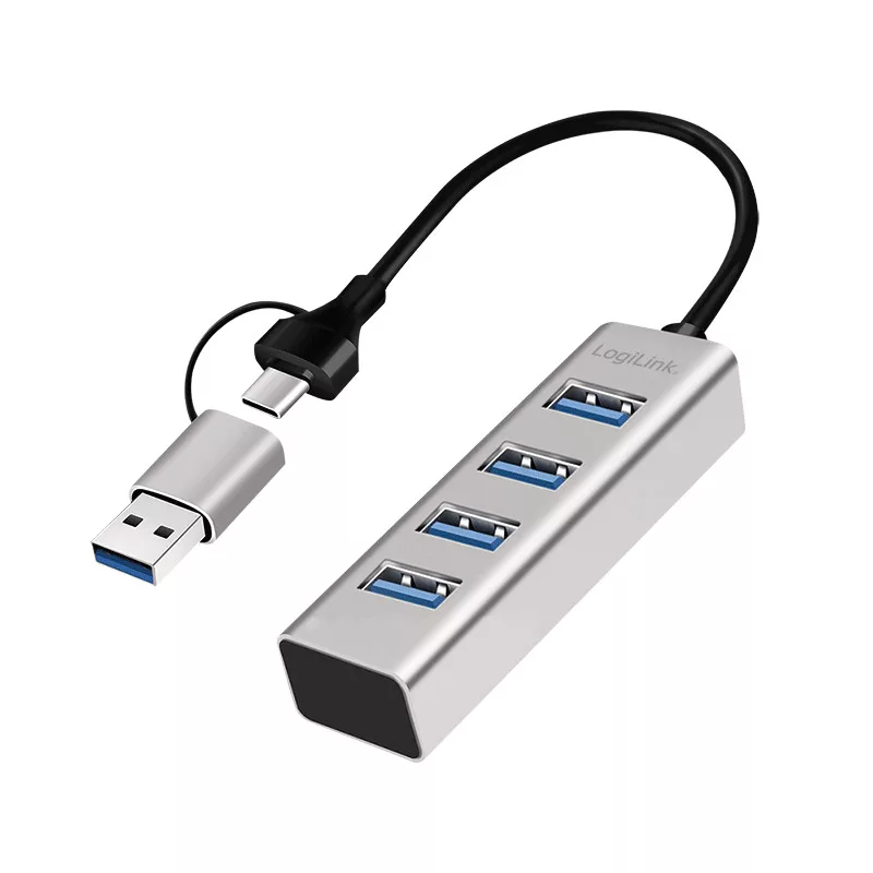 Logilink USB 3.0 hub, 4x USB-A, 5 Gbit/s, 2 az 1-ben csatlakozókábel, ezüst (UA0455)