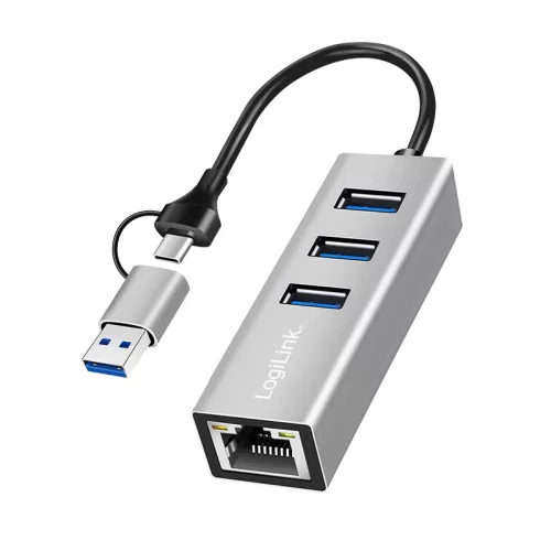 Logilink USB 3.2 Gen 1 hub, 3x USB-A, 1x RJ45, 2 az 1-ben csatlakozókábel, ezüst (UA0440)