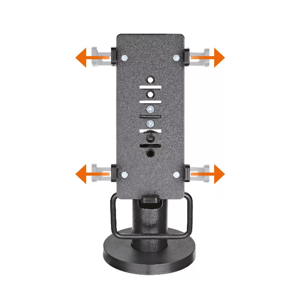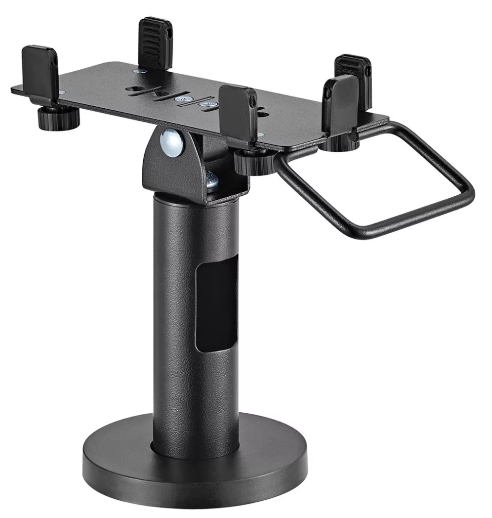 Kiváló minőségű asztali fizetési termináltartó. Az univerzális tartó biztosítja a 7,1 - 10,9 cm-es állítható szélességű fizetési terminálok minden elérhető típusához való alkalmasságot. A tartó lehetővé teszi a fizetési terminál pozicionálását oldalirányú elforgatással és billentéssel. Az asztallaphoz való rögzítés 4 csavarral történik. Rejtett kábelkezelő rendszer. Kiváló minőség és szép design. Specifikációk: