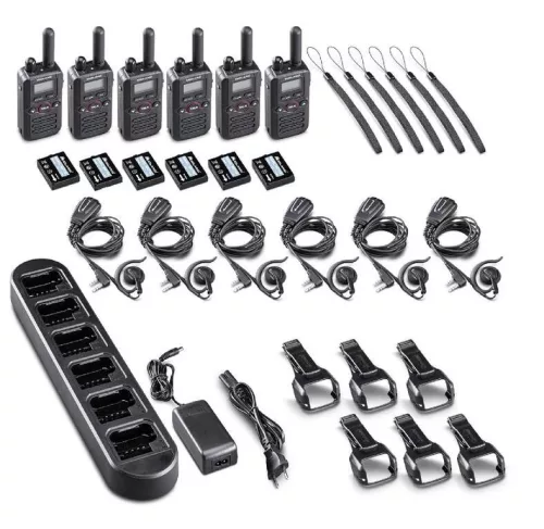 • A csomag tartalma: 6 db BR180 rádió övcsipesszel, 6 db fülhallgató, 6 db Li-Ion akkumulátor, 6 db asztali töltő hálózati adapterrel, 6 db hordozószíj, gyors útmutató