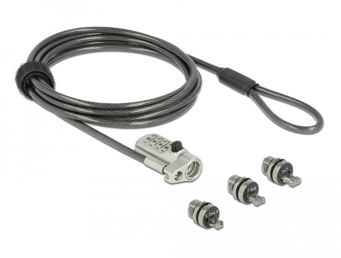 Ennek a biztonsági kábelnek a különlegessége a három mellékelt zárfej. Ezek egyszerűen csatlakoztathatók és váltogathatók igény szerint. A három leggyakoribb zártípus a Kensington (3 x 7 mm), a Noble Wedge (3,2 x 4,5 mm) és a Nano csatlakozós (2,5 x 6 mm) biztosítható ezzel a biztonsági kábellel.