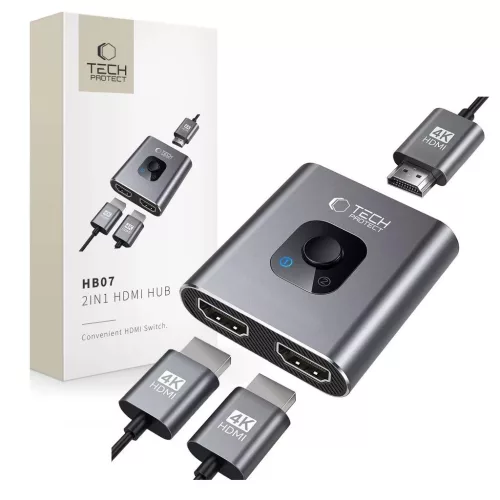A Tech-Protect HB07 adapter egy kompakt eszköz két vevőegység (pl. TV) és egyetlen jelforrás (pl. számítógép vagy set-top box) összekapcsolására. Kiváló minőségű alumíniumból és ABS műanyagból készült, így a könnyű szerkezetet kivételes tartóssággal ötvözi.