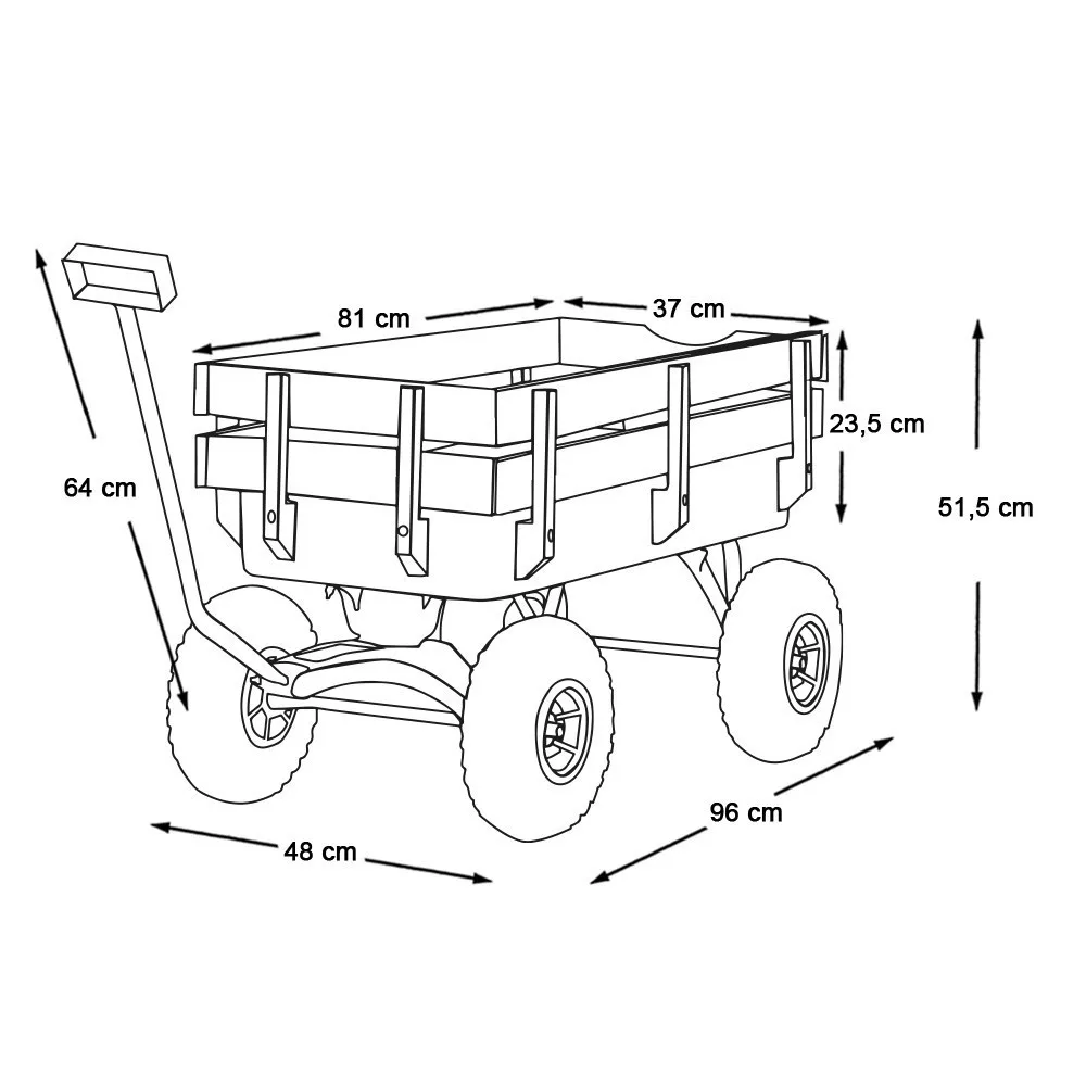 A húzható kialakítású kocsi elforduló első tengellyel és hosszú húzókarral rendelkezik, így pontosan és kényelmesen irányítható. A pumpálható gumikerekek minden terepen sima gördülést biztosítanak.