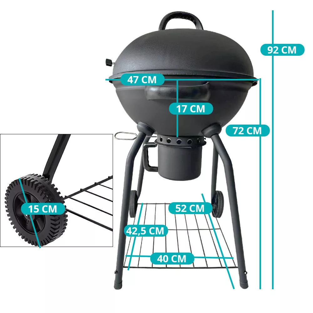 A faszén tüzelésű kerti grill tökéletes választás ízletes húsok, zöldségek és sajtok elkészítéséhez, és igazi sztárrá válhatsz vele a kerti partikon. Acél szerkezetének köszönhetően stabil és megbízható, mégis könnyen mozgatható. Az alján található hamugyűjtő edény egyszerű tisztítást tesz lehetővé, míg a tartópánt stabilan megtartja a fedelet. Az elkészült ételeket a praktikus tartóállványon tarthatod melegen.