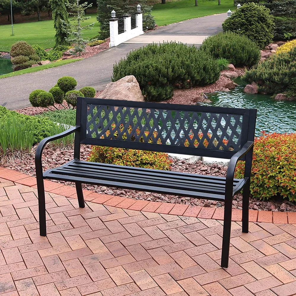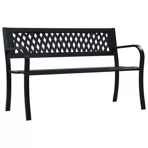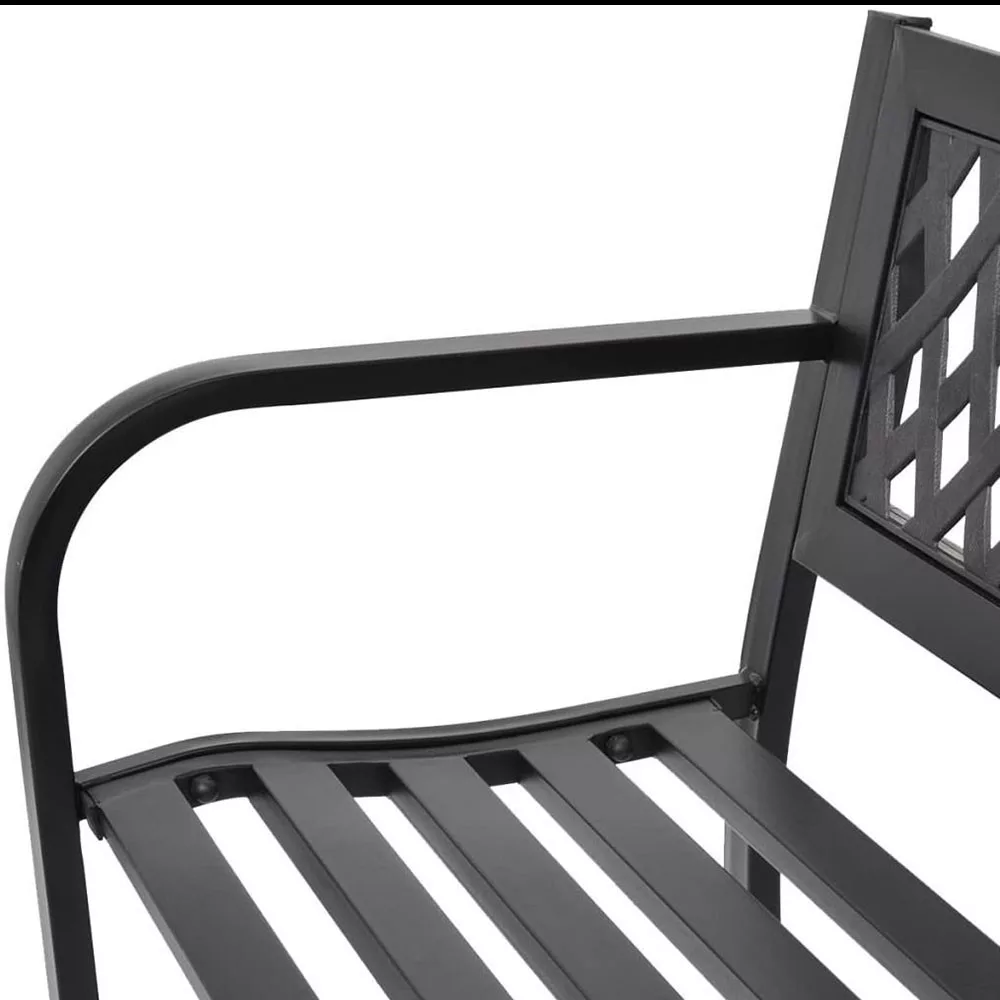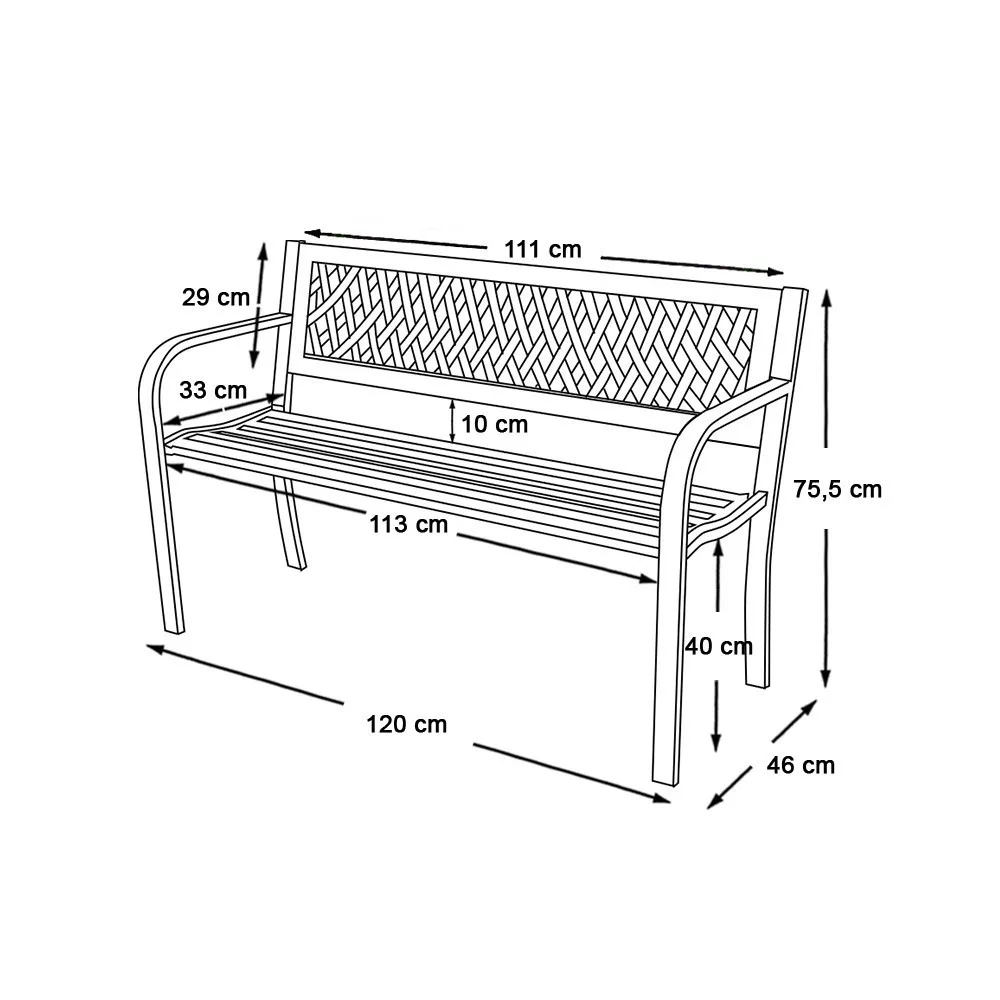 A fekete szín és a rácsos háttámla elegáns, mégis visszafogott stílust képvisel, amely könnyedén illeszkedik bármilyen kültéri környezetbe. A pad esztétikus kiegészítője lehet a kertnek, miközben funkcionálisan is megállja a helyét.