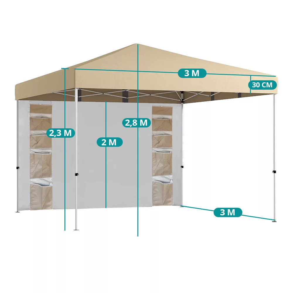 Letisztult, bézs árnyalata természetesen illeszkedik bármilyen környezetbe – legyen szó kertipartiról, árusítóról vagy családi rendezvényről. A zsebek is színben harmonizálnak a pavilonnal, így az összhatás rendezett és igényes.