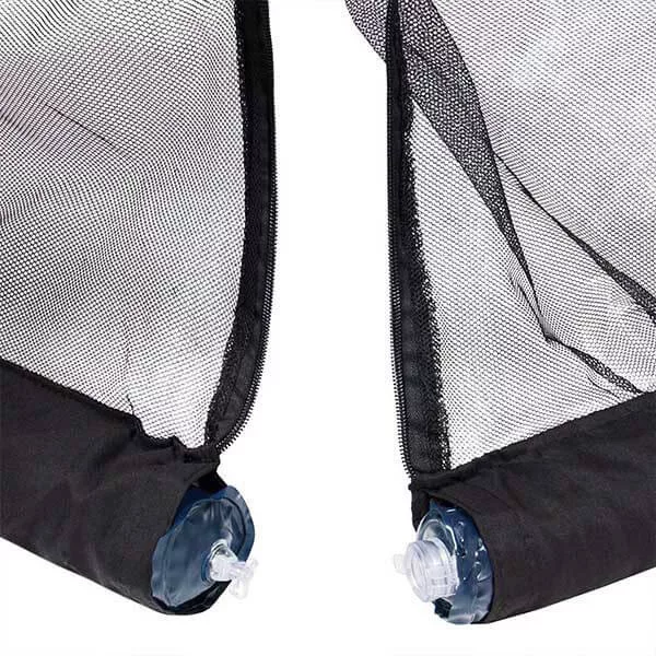 A háló légáteresztő, áttetsző anyagból készült, így nem zár el a kilátástól. Az aljába víz tölthető, ami megakadályozza a lebegést, a bejáratot pedig praktikus cipzár zárja.